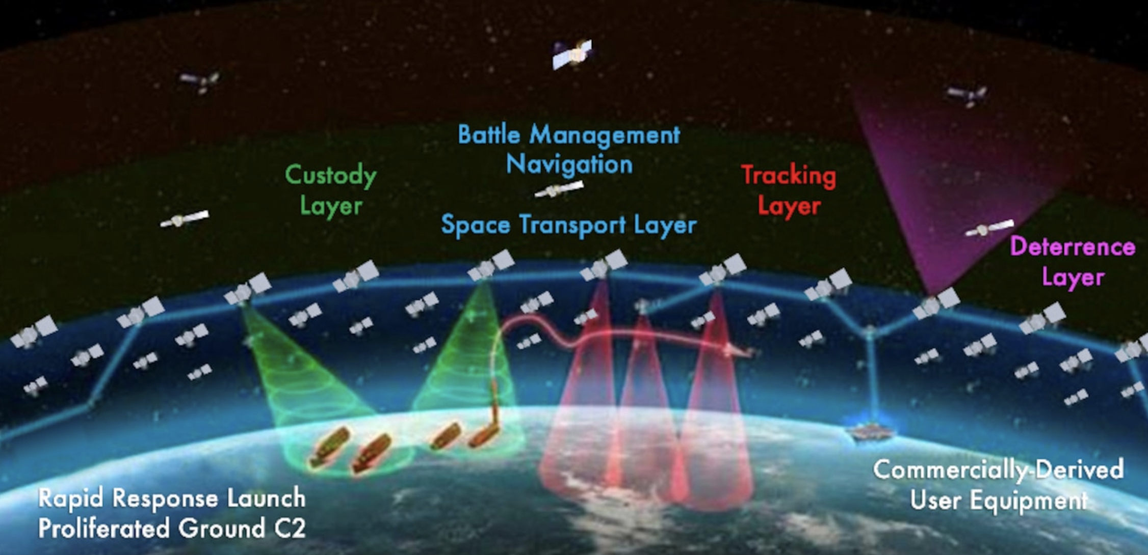 The constellation, which SDA calls the proliferated warfighter space architecture, includes a Transport Layer of interconnected communications satellites and a Tracking Layer of missile-detection and warning sensor satellites.